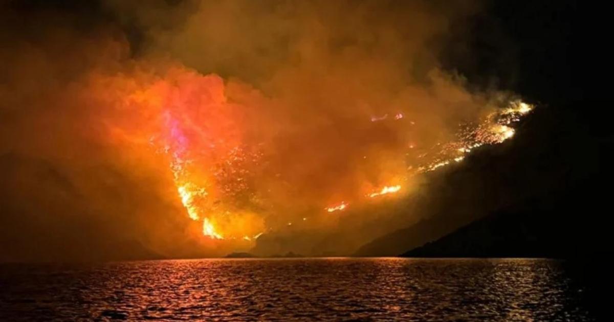 Σύμφωνα με πληροφορίες, η πυρκαγιά προκλήθηκε από σκάφος που πετούσε πυροτεχνήματα, περίπου στις 22:40. Η φωτιά καίει το μοναδικό πευκοδάσος του νησιού, σε δύσβατο σημείο, που δεν έχει δρόμο.