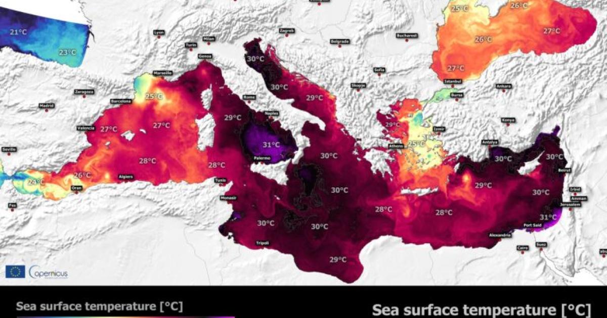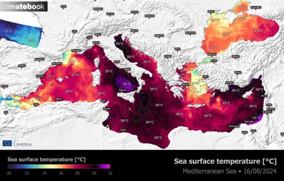 «Στις 10 Αυγούστου 2024 σημειώθηκε νέο ρεκόρ θερμοκρασίας της θάλασσας για τη Μεσόγειο με τη μέση θερμοκρασία της θάλασσας να φτάνει τους 28.15 °C. Από τις 10/08 μέχρι και τις 16/08 το ρεκόρ θερμοκρασίας της θάλασσας για τη Μεσόγειο καταρρίφθηκε άλλες 4 φορές, με το νέο ρεκόρ να σημειώνεται στις 15 Αυγούστου 2024 με μέση τιμή της θερμοκρασίας της θάλασσας στους 28.5 °C.