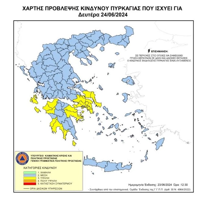Η Γενική Γραμματεία Πολιτικής Προστασίας (civilprotection.gov.gr) του Υπουργείου Κλιματικής Κρίσης & Πολιτικής Προστασίας έχει ενημερώσει τις αρμόδιες υπηρεσιακά εμπλεκόμενες κρατικές υπηρεσίες, καθώς και τις Περιφέρειες και τους Δήμους των ανωτέρω περιοχών, ώστε να βρίσκονται σε αυξημένη ετοιμότητα πολιτικής προστασίας προκειμένου να αντιμετωπίσουν άμεσα τυχόν επεισόδια πυρκαγιών.