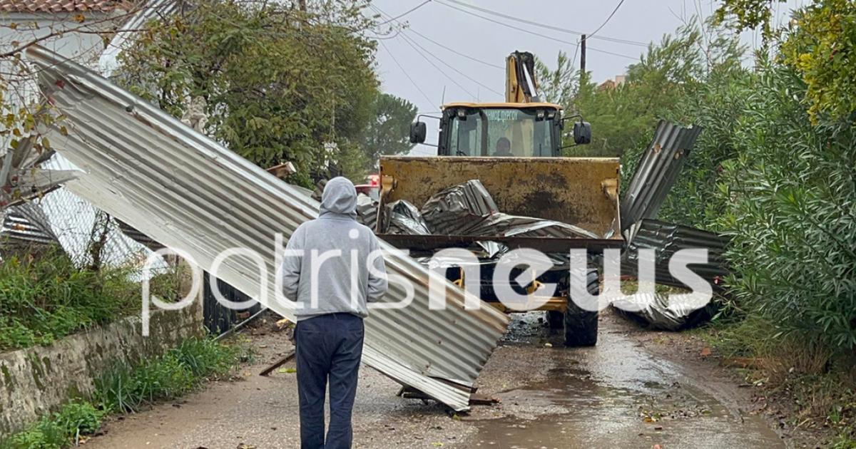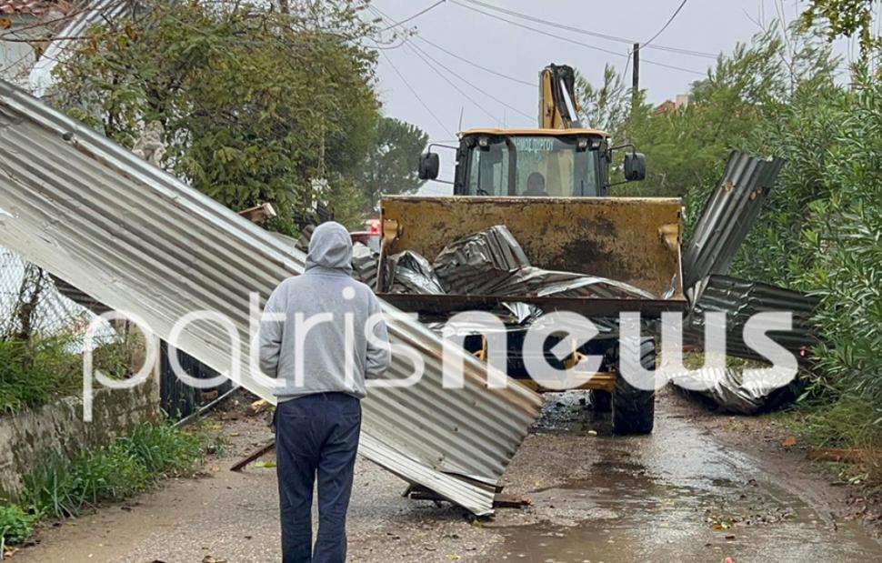 Ο ανεμοστρόβιλος «ξήλωσε» αποθηκευτικό χώρο από τσίγκους, με αποτέλεσμα οι τεράστιοι τσίγκοι να βρεθούν στη μέση του δρόμου, σύμφωνα με το patrisnews.com.