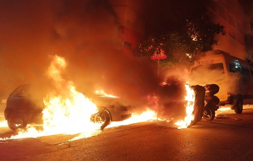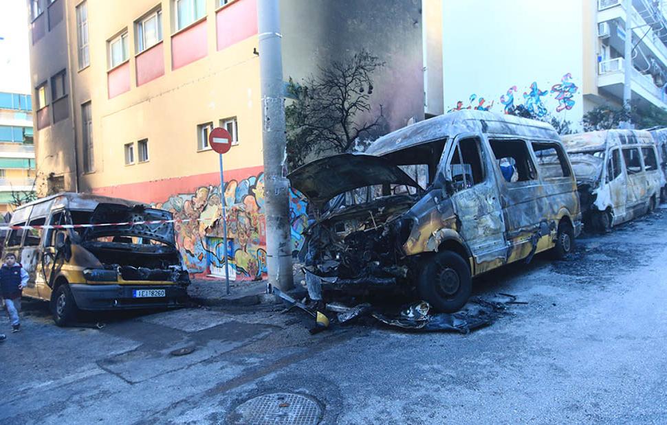 Εμπρηστική επίθεση στου Ζωγράφου – Πυρπόλησαν σχολικά λεωφορεία, αυτοκίνητα και μοτοσικλέτες