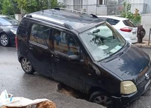 Σε μια μεγάλη τρύπα έπεσε το πρόσθιο τμήμα ενός ΙΧ αυτοκινήτου, κατά τη διάρκεια της κακοκαιρίας που έπληξε την Αττική, στην περιοχή του Αγίου Ελευθερ...