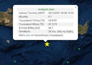 Όλη την ανατολική Κρήτη ταρακούνησε ο σεισμός των 5,7 Ρίχτερ που σημειώθηκε λίγα λεπτά μετά τις 07:00, με επίκεντρο τον θαλάσσιο χώρο 48 χιλιόμετρα νο...