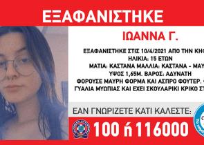 Συναγερμός έχει σημάνει στις Αρχές για την εξαφάνιση 15χρονης από την Κηφισιά. Τα ίχνη της χάθηκαν το Σάββατο 10 Απριλίου. Αναλυτικά η ανακοίνωση του...