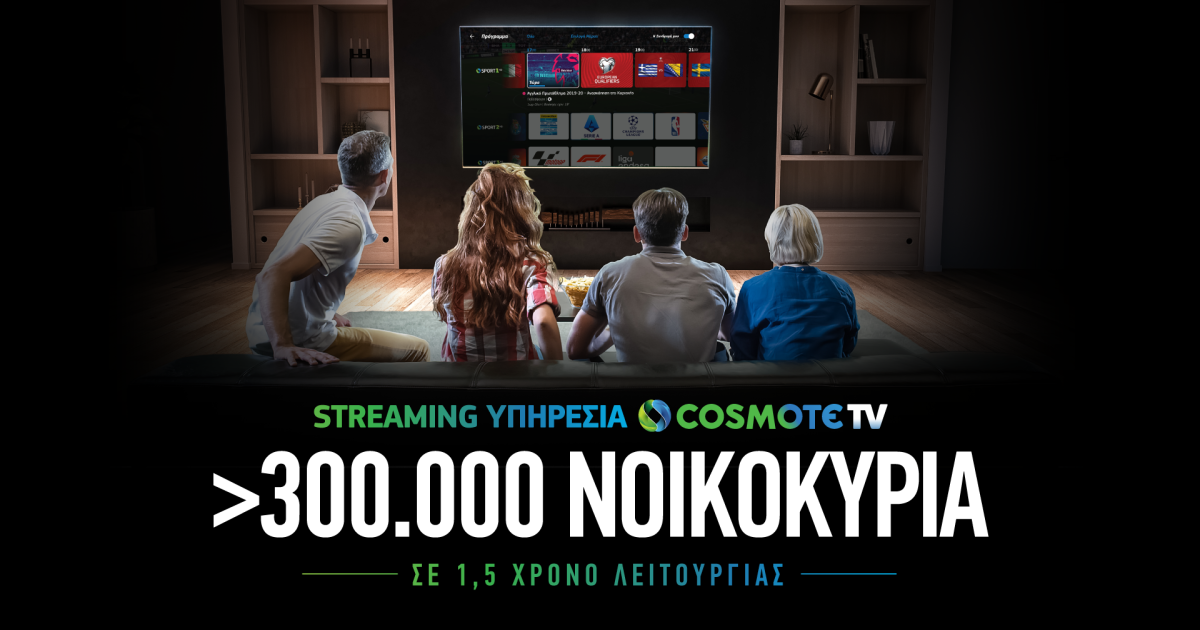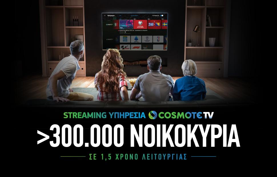 Ξεπέρασαν τις 300.000 τα νοικοκυριά που έχουν πρόσβαση στη streaming υπηρεσία της COSMOTE TV, μέσα σε μόλις ενάμιση χρόνο λειτουργίας. Διαθέτοντας καινοτόμα χαρακτηριστικά και δυνατότητες, συνδυαστικά με το ολοκληρωμένο και ποιοτικό τηλεοπτικό περιεχόμενο σε όλες τις κατηγορίες προγράμματος (αθλητικά, κινηματογραφικά, ντοκιμαντέρ), αποτελεί σήμερα, την κορυφαία ελληνική streaming υπηρεσία.