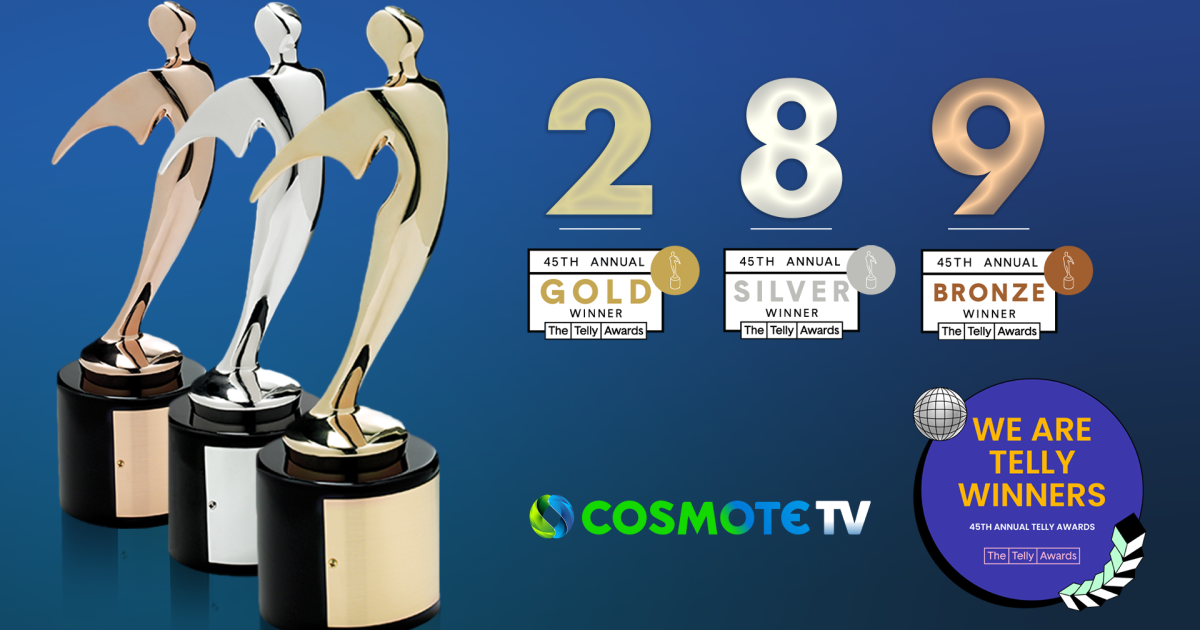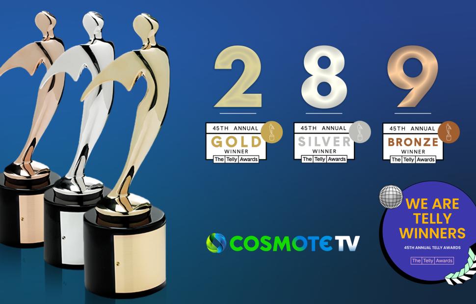 Δεκαεννιά βραβεία απέσπασε η COSMOTE TV στην 45η απονομή των Telly Awards, για την πρωτότυπη προώθηση του περιεχομένου της, τη χρήση καινοτόμων τεχνολογιών και τη δημιουργική εικαστική προσέγγιση σε εκπομπές και pop-up κανάλια. Στον μακροβιότερο διαγωνισμό τηλεόρασης και video παγκοσμίως, που πραγματοποιείται κάθε χρόνο στη Νέα Υόρκη, η COSMOTE TV διακρίθηκε ανάμεσα σε παγκοσμίου φήμης δίκτυα και τηλεοπτικές πλατφόρμες, όπως Netflix, Paramount Pictures, PlayStation Studios, National Geographic, NBC, MTV Entertainment Studios, λαμβάνοντας 2 Gold, 8 Silver και 9 Bronze βραβεία σε 9 διαφορετικές κατηγορίες.