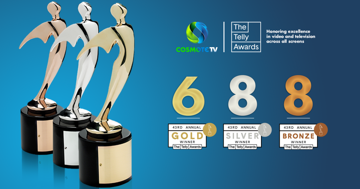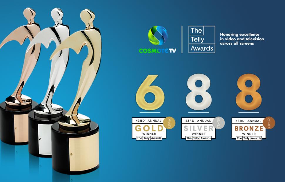 22 διακρίσεις απέσπασε η COSMOTE TV στα 43α «Telly Awards», για την πρωτότυπη προώθηση του περιεχομένου της, τη χρήση καινοτόμων τεχνολογιών και τη δημιουργική εικαστική προσέγγιση σε εκπομπές και pop-up κανάλια.