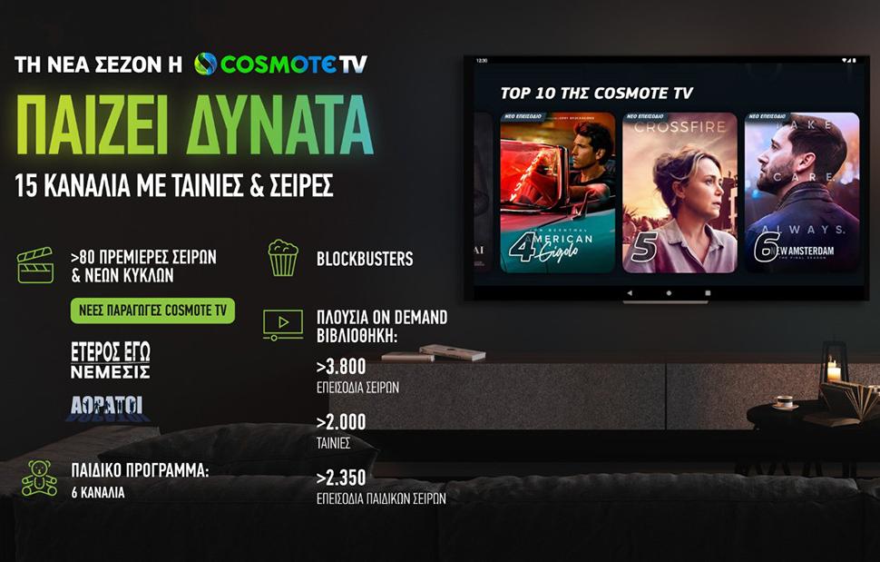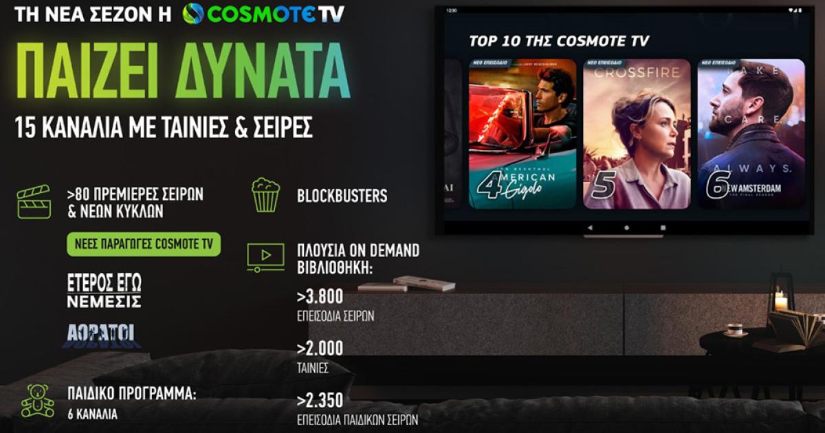 Τη νέα σεζόν η COSMOTE TV «παίζει δυνατά» με το συναρπαστικότερο τηλεοπτικό και κινηματογραφικό περιεχόμενο για όλη την οικογένεια.80 πρεμιέρες σειρών και νέων κύκλων σειρών και μεγάλες κινηματογραφικές πρεμιέρες, όπως το Top Gun: Maverick έρχονται σε αποκλειστική συνεργασία με 40 κορυφαία στούντιο και εταιρείες παραγωγής (Paramount, BBC, Fremantle, ITVκ.λπ.),ενώ και τα παιδιά κάθε ηλικίας μπορούν να απολαμβάνουν το πλούσιο παιδικό πρόγραμμα της COSMOTETV.