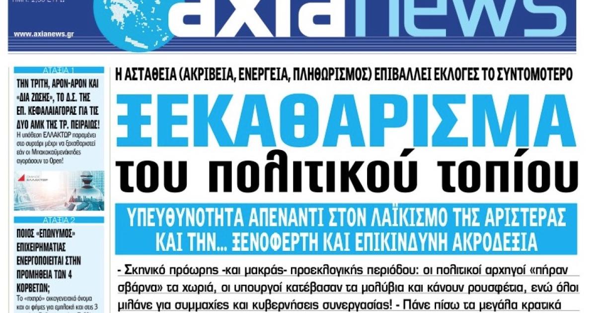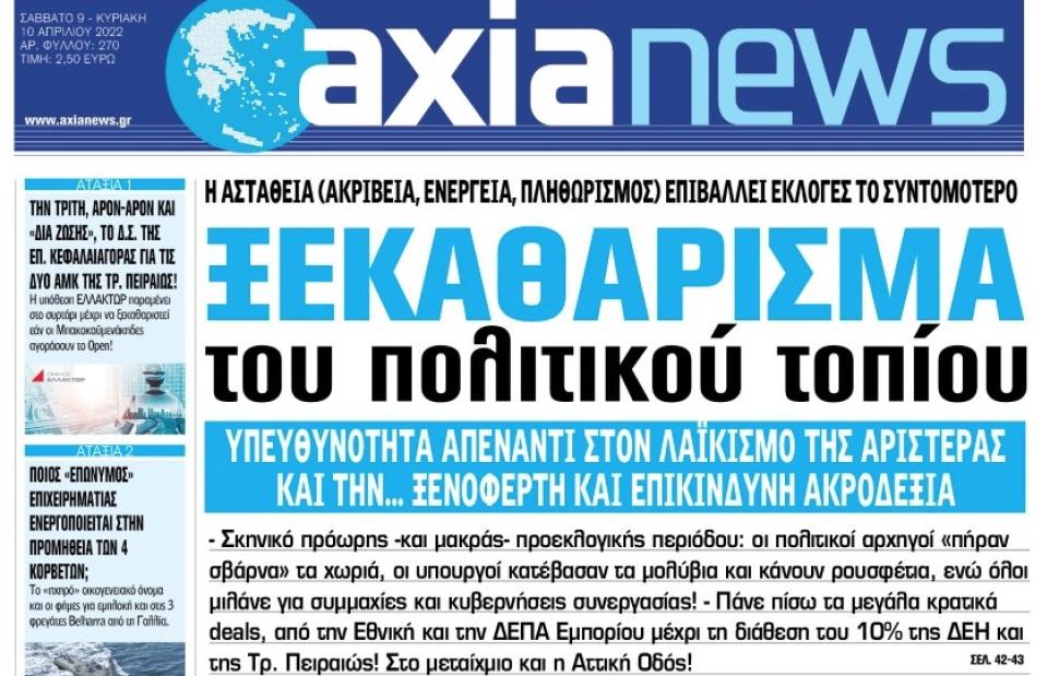 Με τίτλο: «Ξεκαθάρισμα του πολιτικού τοπίου» κυκλοφορεί αύριο, Σάββατο 9 Απριλίου, η «Axianews».