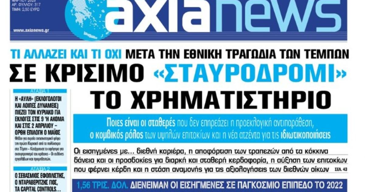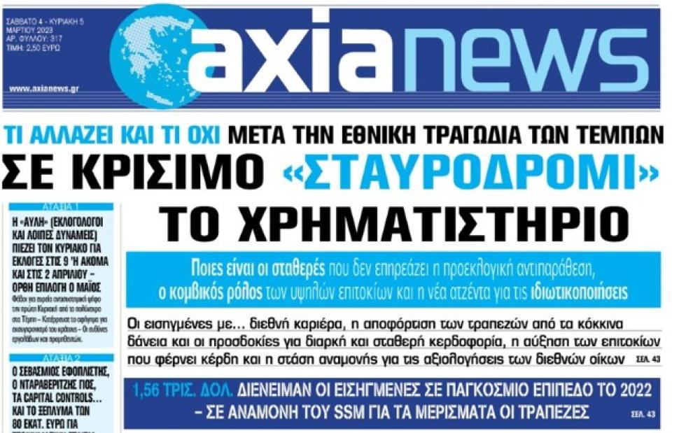 Με τίτλο: «Σε κρίσιμο «σταυροδρόμι» το Χρηματιστήριο» κυκλοφορεί αύριο, Σάββατο 3 Μαρτίου, η «Axianews».