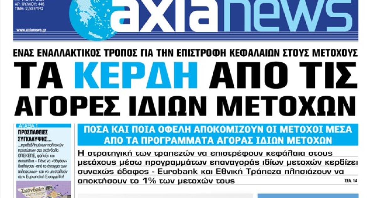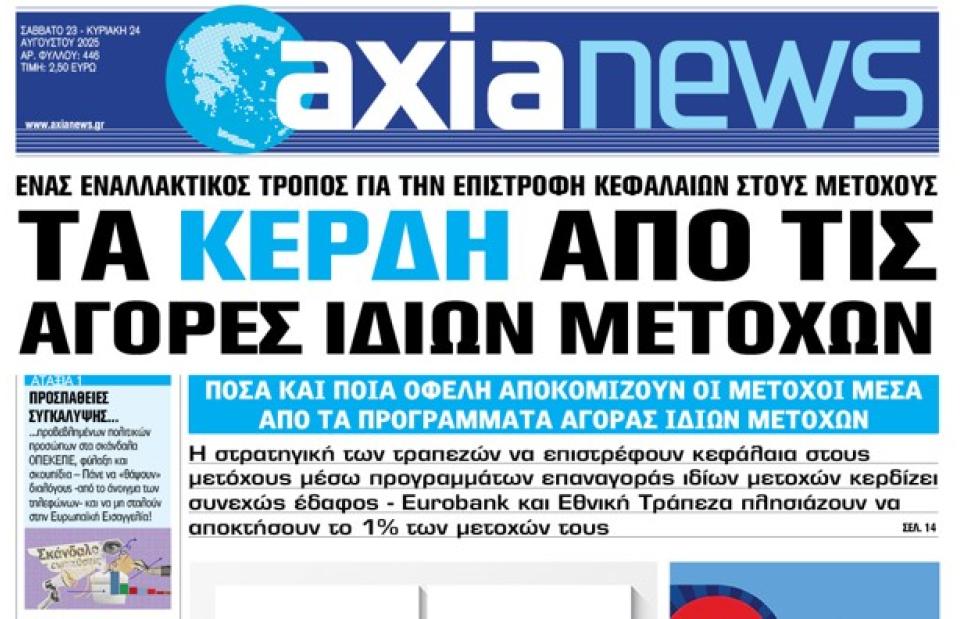 Με τίτλο: «Τα κέρδη από τις αγορές ιδίων μετοχών» κυκλοφορεί αύριο, Σάββατο 23 Αυγούστου, η «Axianews».