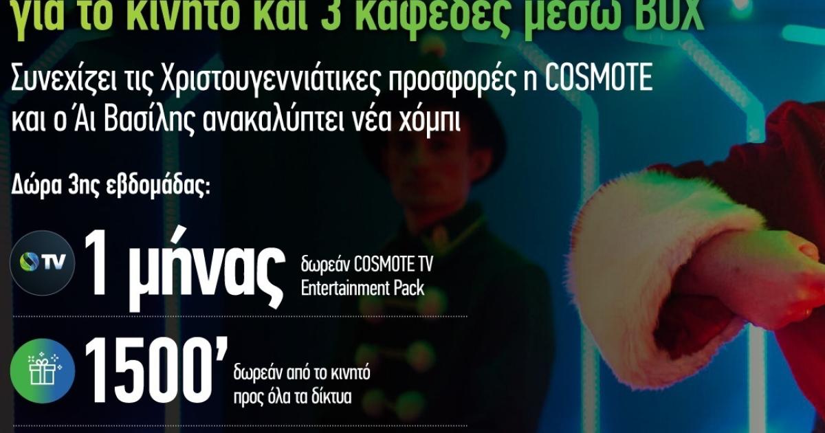 Με ολοένα μεγαλύτερα και περισσότερα δώρα η COSMOTE φέρνει τα φετινά Χριστούγεννα ακόμα πιο κοντά, καθώς μπαίνει στην τρίτη συνεχόμενη εβδομάδα δωρεάν προσφορών για τους συνδρομητές της.
