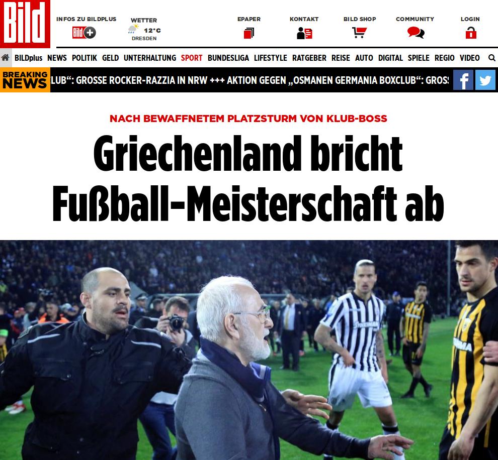«Η Ελλάδα βάζει τέλος στο ποδόσφαιρο!» γράφει στην ηλεκτρονική της έκδοση η εφημερίδα Bild, σχολιάζοντας ότι «το ελληνικό ποδόσφαιρο βυθίζεται στο χάος και τη βία».