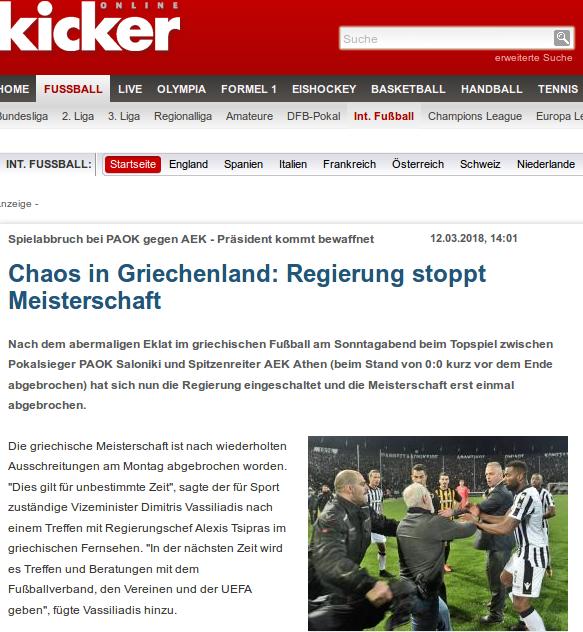 «Χάος στην Ελλάδα: η κυβέρνηση σταματά το πρωτάθλημα», σχολιάζει το αθλητικό περιοδικό Kicker στην ηλεκτρονική του έκδοση, υπογραμμίζοντας την είσοδο του ένοπλου ιδιοκτήτη του ΠΑΟΚ στον αγωνιστικό χώρο και τις απειλές που εξαπέλυσε κατά του διαιτητή της αναμέτρησης ΠΑΟΚ-ΑΕΚ.