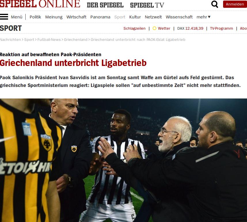 Ως «αντίδραση στον ένοπλο πρόεδρο του ΠΑΟΚ (…) η Ελλάδα διακόπτει τη διεξαγωγή του πρωταθλήματος», γράφει το περιοδικό Spiegel επίσης στην ηλεκτρονική του έκδοση, επισημαίνοντας μεταξύ άλλων ότι «ο Ιβάν Σαββίδης εισέβαλε την Κυριακή μαζί με το όπλο του στον αγωνιστικό χώρο».