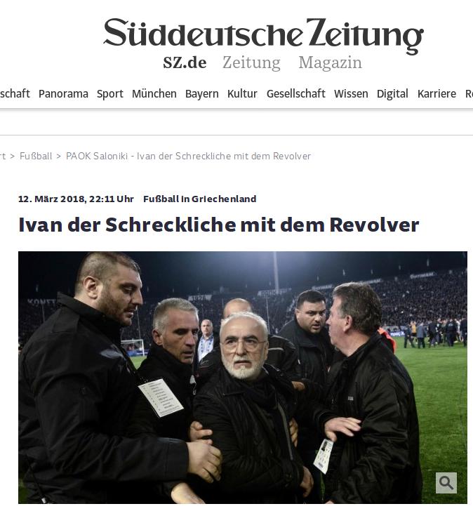 «Ο Ιβάν ο Τρομερός με το ρεβόλβερ», γράφει στον τίτλο εκτενούς δημοσιεύματός της η Süddeutsche Zeitung, σχολιάζοντας την έφοδο του Ιβάν Σαββίδη στον αγωνιστικό χώρο του παιχνιδιού μεταξύ ΠΑΟΚ και ΑΕΚ στη Θεσσαλονίκη.