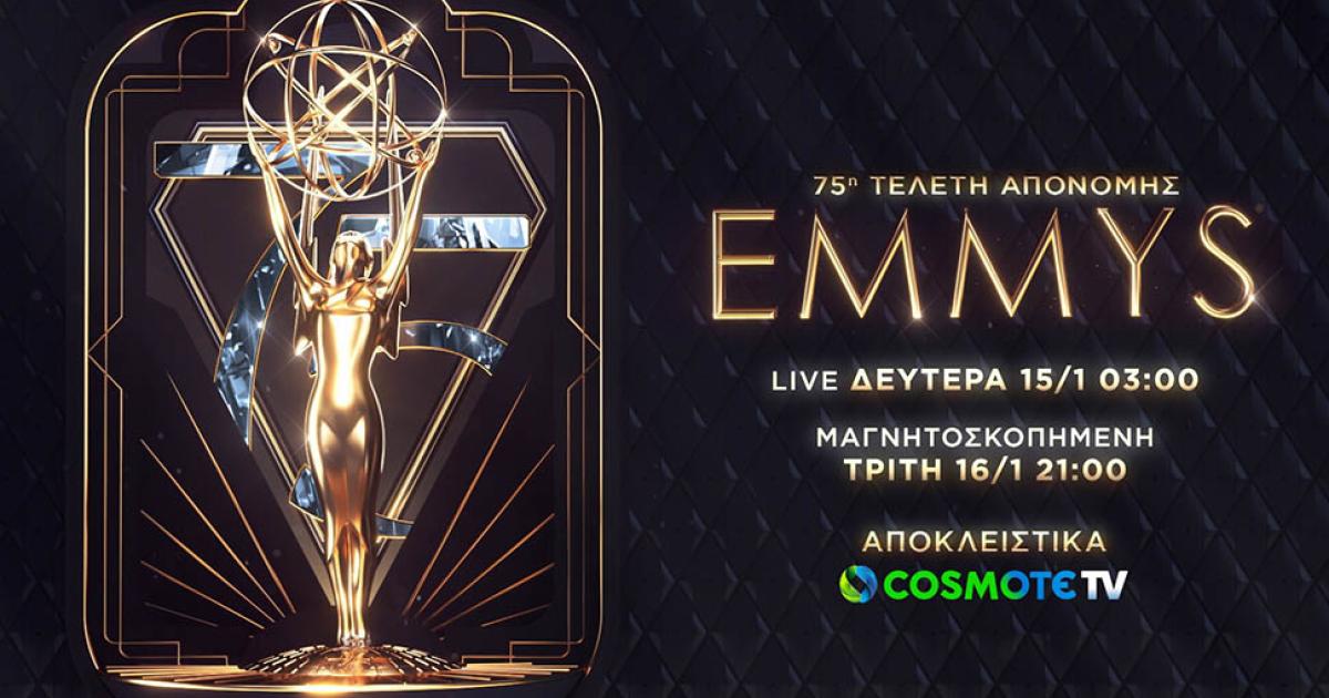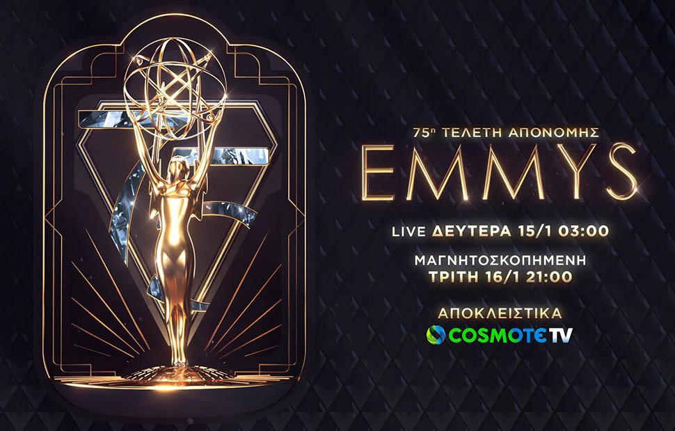 Η 75η τελετή απονομής των βραβείων Emmy, ενός από τους μεγαλύτερους τηλεοπτικούς θεσμούς παγκοσμίως που αναγνωρίζει τα επιτεύγματα στον χώρο της «μικρής οθόνης», έρχεται ζωντανά και αποκλειστικά στην COSMOTE TV. Η λαμπερή βραδιά θα μεταδοθεί με πρωτότυπο ήχο, τα ξημερώματα της Τρίτης 16/1 (03.00) από το COSMOTE CINEMA 1HD. Το βράδυ της Τρίτης (16/1) στις 21.00, θα ακολουθήσει στο ίδιο κανάλι, η μετάδοση της τελετής με ελληνικούς υπότιτλους.