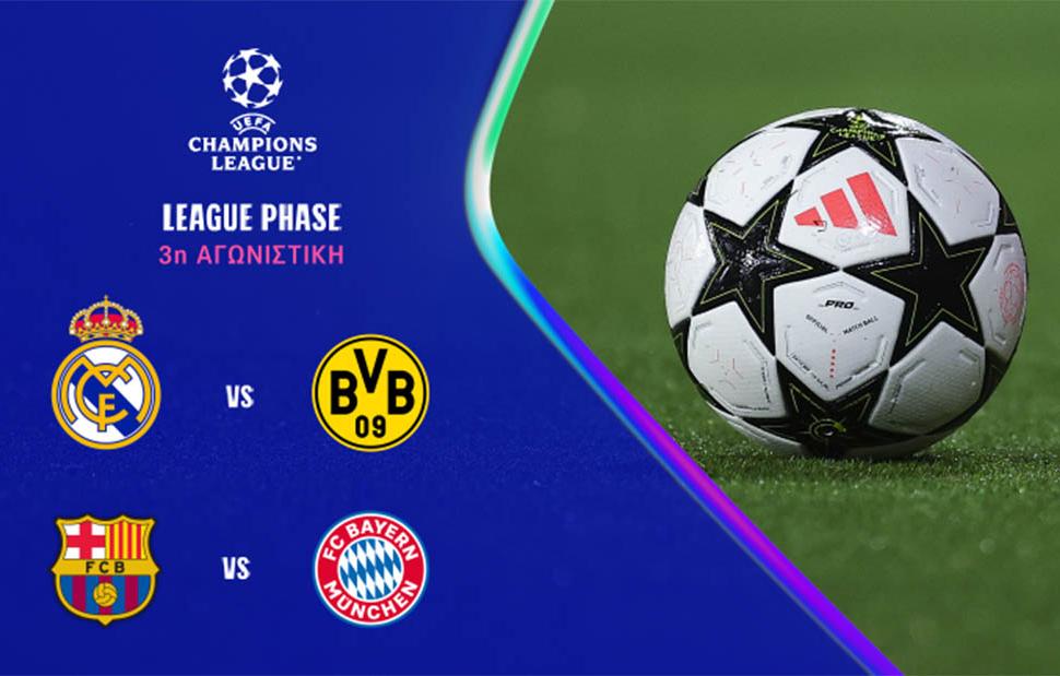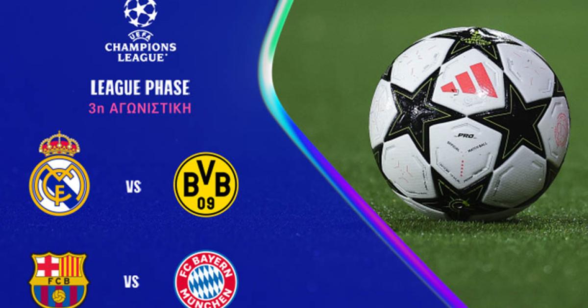 To UEFA Champions League επιστρέφει με την 3η αγωνιστική της League Phase να διεξάγεται το διήμερο 22-23/10 και την COSMOTE TV να φιλοξενεί και τους 18 αγώνες. Ξεχωρίζει η επανάληψη του περσινού τελικού, με την πρωταθλήτρια Ευρώπης Ρεάλ Μαδρίτης να υποδέχεται την Ντόρτμουντ (22/10, 22.00, COSMOTE SPORT 2HD), καθώς και η αναμέτρηση της Βαρκελώνης ανάμεσα στη Μπαρτσελόνα και τη Μπάγερν Μονάχου (23/10, 22.00, COSMOTE SPORT 2HD). Οι 2 αγώνες θα είναι διαθέσιμοι και σε 4K ανάλυση μέσα από το κανάλι COSMOTESPORT 4K. Η δημοσιογραφική ομάδα των καναλιών COSMOTE SPORT θα βρίσκεται στις επάλξεις με πλούσιο ρεπορτάζ και ειδικές εκπομπές αφιερωμένες στην κορυφαία διασυλλογική διοργάνωση.