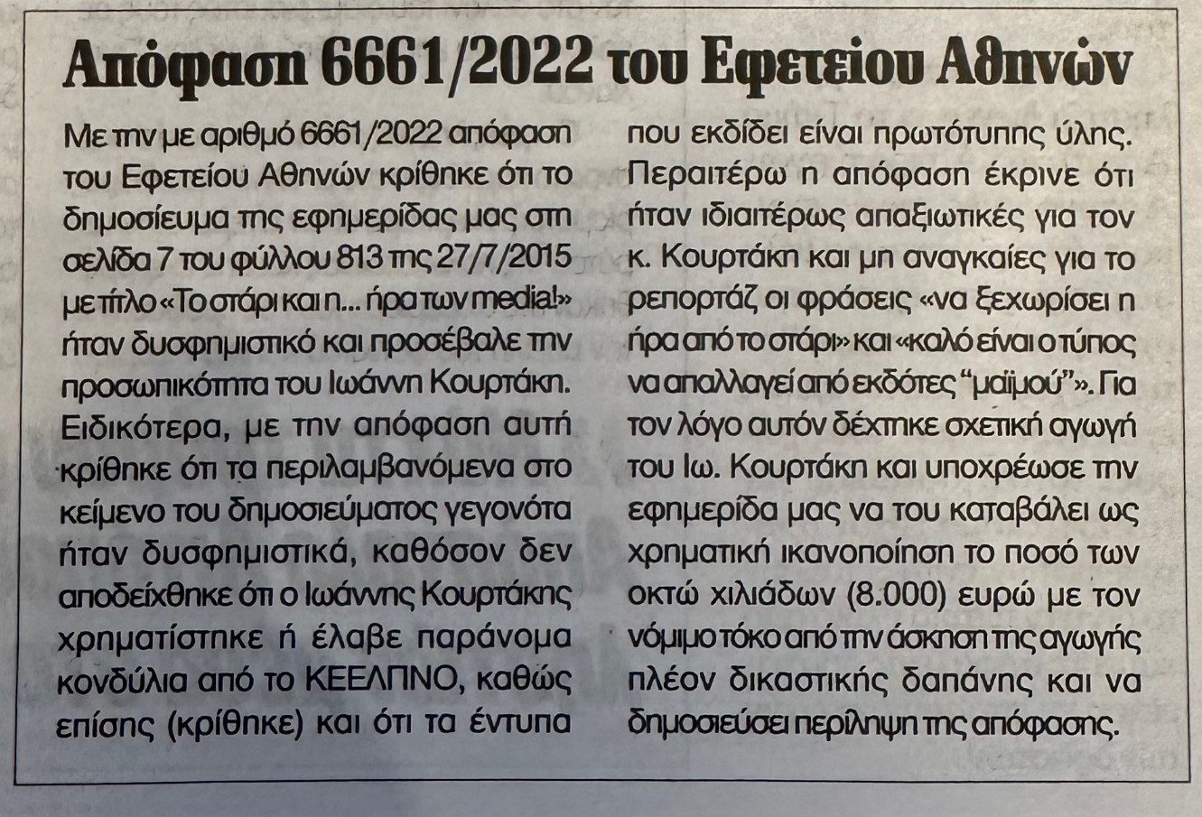 Ειδικότερα, και σύμφωνα με την απόφαση 6661/2022 του Εφετείου Αθηνών, κρίθηκε ότι το άρθρο με τίτλο «Το στάρι και η... ήρα των media» ήταν δυσφημιστικό και προσέβαλε την προσωπικότητα του Γιάννη Κουρτάκη.