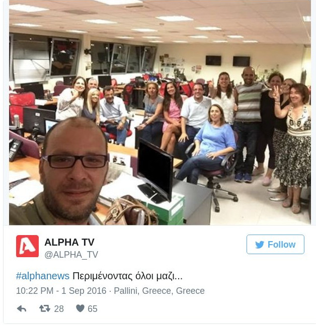 Οι εργαζόμενοι του Alpha πριν την ανακοίνωση του αποτελέσματος, πριν μάθουν δηλαδή ότι ο σταθμός στον οποίο εργάζονται δεν πήραν άδεια, πόσταραν στο Twitter μια φωτογραφία από την αίθουσα σύνταξης όπου όλοι μαζί ανέμεναν την ανακοίνωση των αποτελεσμάτων.