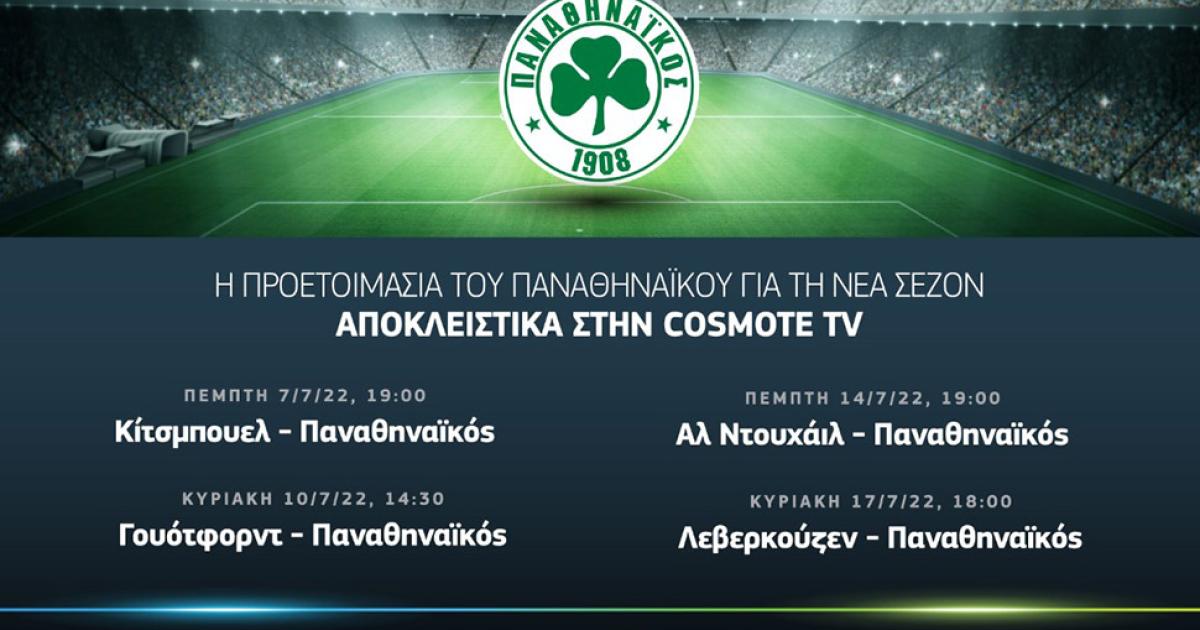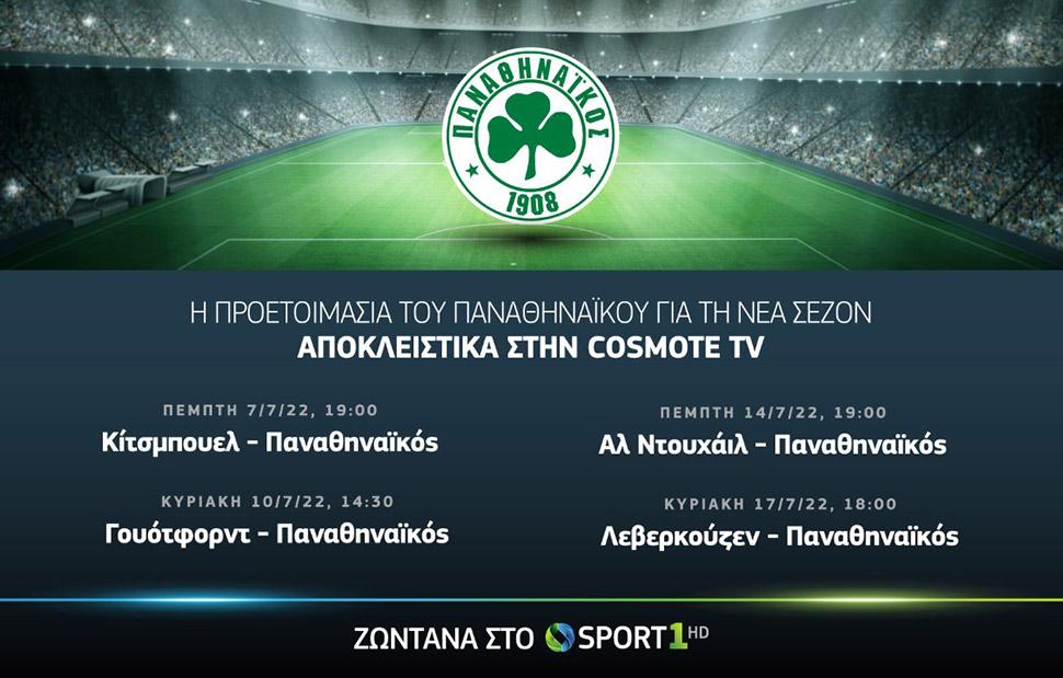Ζωντανά και αποκλειστικά στην COSMOTE TV ξεκινάει ο Παναθηναϊκός την προετοιμασία του για τη νέα ποδοσφαιρική σεζόν. Στην ατζέντα του «τριφυλλιού» για τον μήνα Ιούλιο περιλαμβάνονται 4 φιλικά ματς, τα οποία οι τηλεθεατές θα παρακολουθήσουν στα κανάλια COSMOTE SPORT, μαζί με το πλούσιο ρεπορτάζ της έμπειρης δημοσιογραφικής ομάδας της COSMOTE TV.