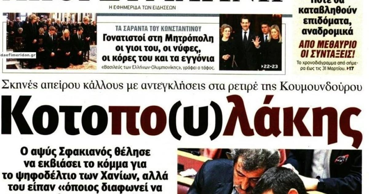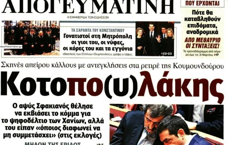Ο τίτλος που ξεχωρίζει από τις σημερινές εφημερίδες ανήκει στην «Απογευματινή». «Κοτοπο(υ)λάκης», είναι ο τίτλος της εφημερίδας, σχολιάζοντας με αιχμηρό τρόπο τα όσα έγιναν το Σαββατοκύριακο στον ΣΥΡΙΖΑ με τον Παύλο Πολάκη που τελικά οδήγησαν σε νέα κωλοτούμπα τον βουλευτή και πρώην υπουργό.