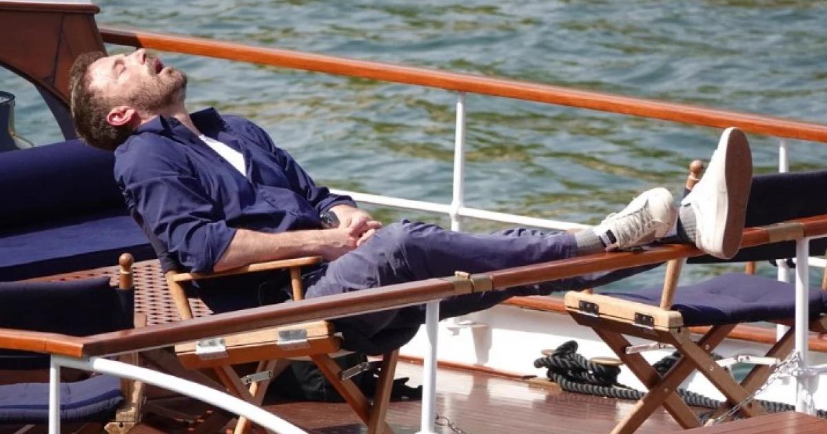 Ντυμένος με ναυτικό μπλε πουκάμισο, μπλε παντελόνι και λευκά αθλητικά παπούτσια, ο Μπεν Αφλεκ ξάπλωσε και έβαλε τα πόδια του στα κάγκελα.