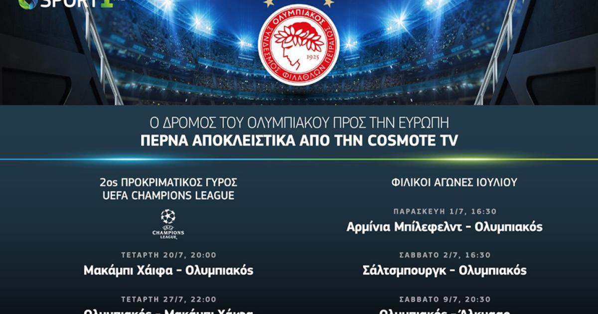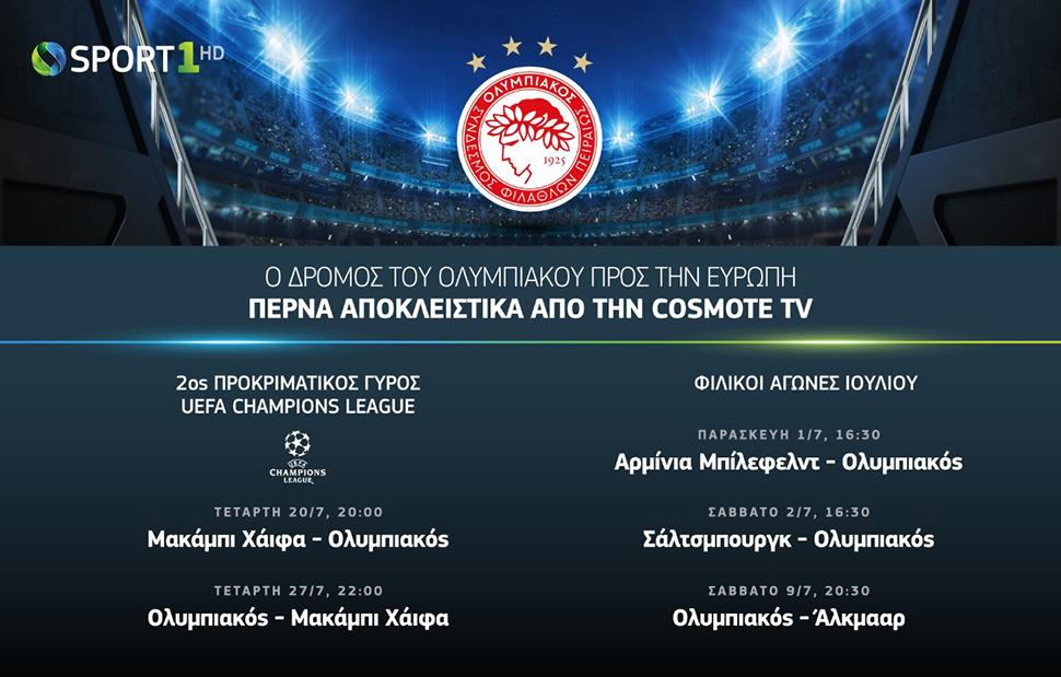 Το COSMOTE SPORT1HD θα μεταδώσει ζωντανά και αποκλειστικά και τις δύο αναμετρήσεις των Πρωταθλητών Ελλάδας απέναντι στην Μακάμπι Χάιφα. Το πρώτο «ραντεβού» των δύο ομάδων έχει οριστεί για την Τετάρτη 20 Ιουλίου στις 20:00 στο Ισραήλ, ενώ η ρεβάνς θα διεξαχθεί μία εβδομάδα αργότερα, Τετάρτη 27 Ιουλίου στις 22:00, στο «Γεώργιος Καραϊσκάκης».