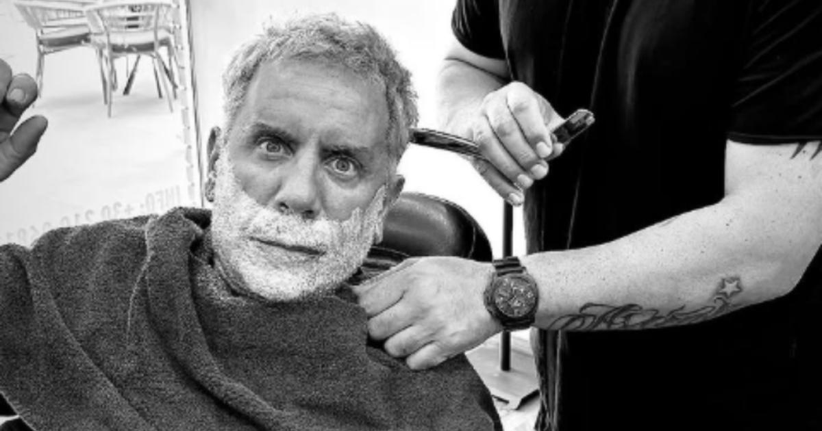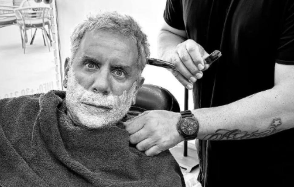 Στη φωτογραφία, ο Γιώργος Μαζωνάκης φαίνεται καθισμένος στην καρέκλα του κουρείου, με αφρό ξυρίσματος στο πρόσωπο, αποτυπώνοντας τη στιγμή της φροντίδας της εμφάνισής του.