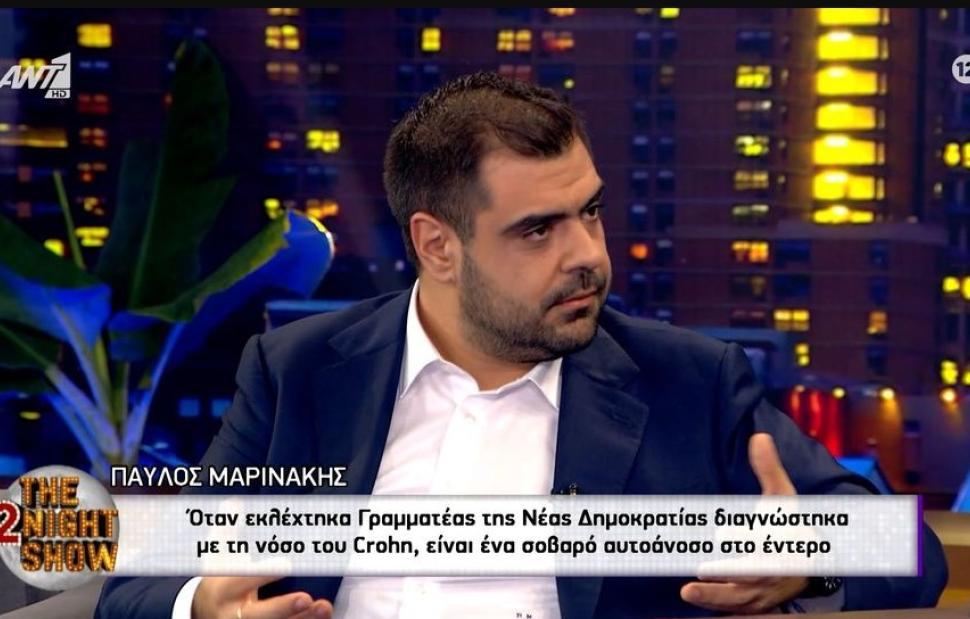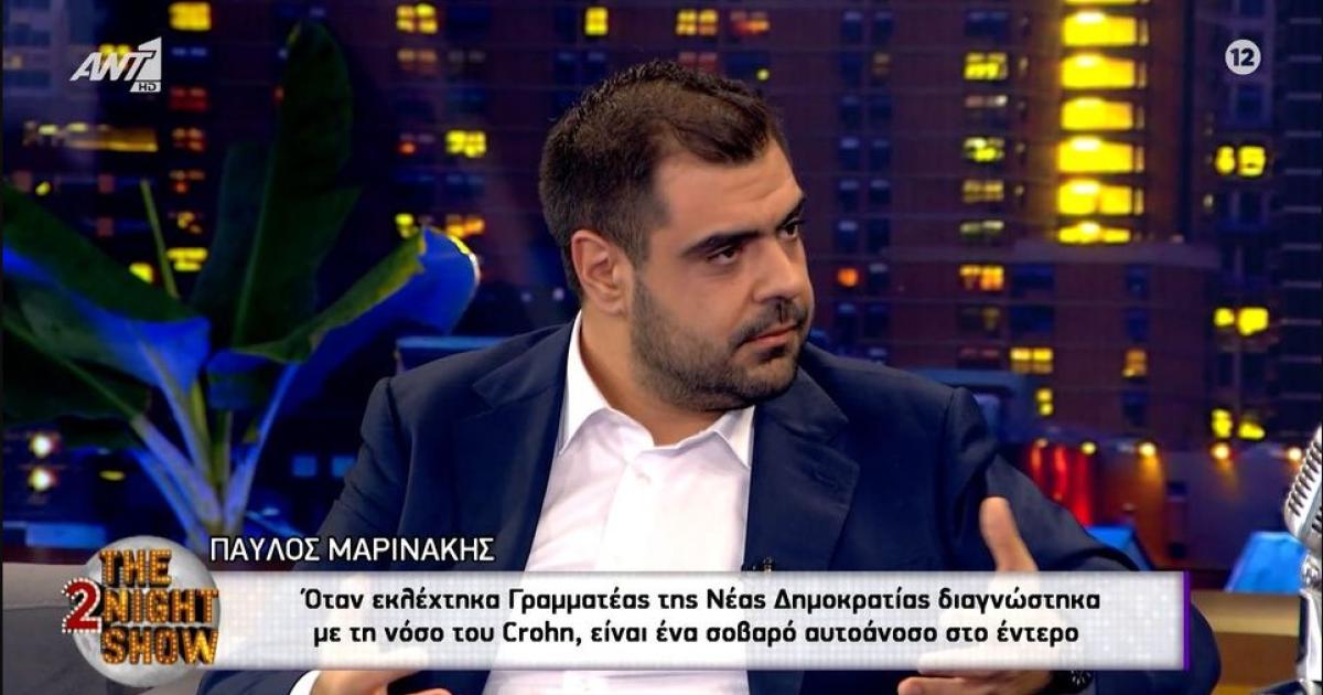 Σε μια προσωπική εξομολόγηση για την νόσο του Crohn, με την οποία διαγνώστηκε πριν από περίπου 2 χρόνια, με αποτέλεσμα, όπως είπε, να αλλάξει η ζωή του, προχώρησε ο κυβερνητικός εκπρόσωπος, Παύλος Μαρινάκης, μιλώντας το βράδυ της Τρίτης στον Γρηγόρη Αρναούτογλου.