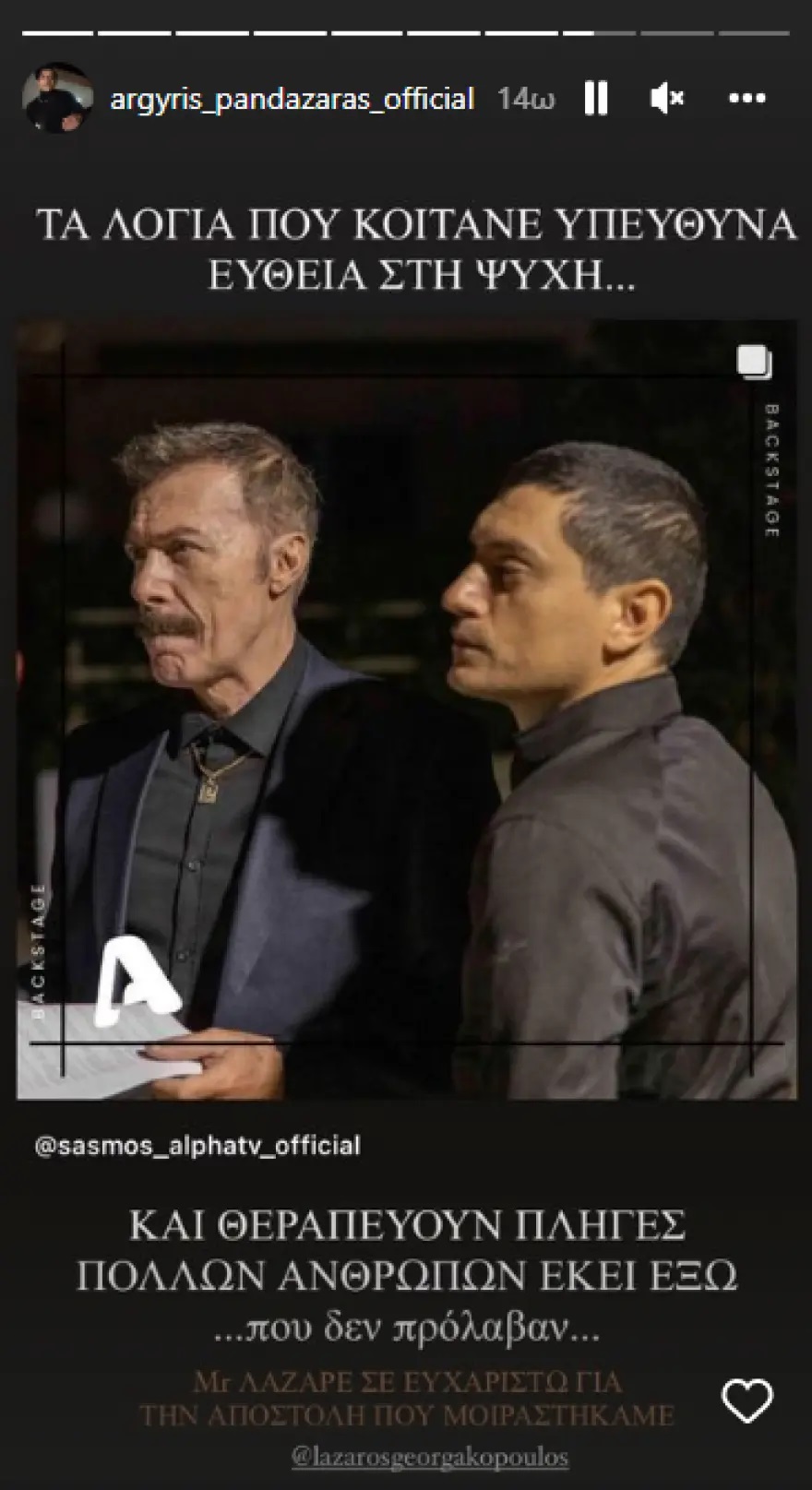 Ο «Μάκης» θέλησε να ευχαριστήσει τον τηλεοπτικό πατέρα του, Λάζαρο Γεωργακόπουλο δημόσια. Μέσα από τον προσωπικό του λογαριασμό στο Instagram, ο Αργύρης Πανταζάρας ανέβασε μερικά κοινά τους στιγμιότυπα από τα γυρίσματα. Σε ένα από αυτά έγραψε: «Mr Λάζαρε σε ευχαριστώ για την αποστολή που μοιραστήκαμε».