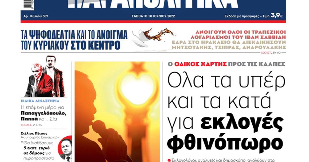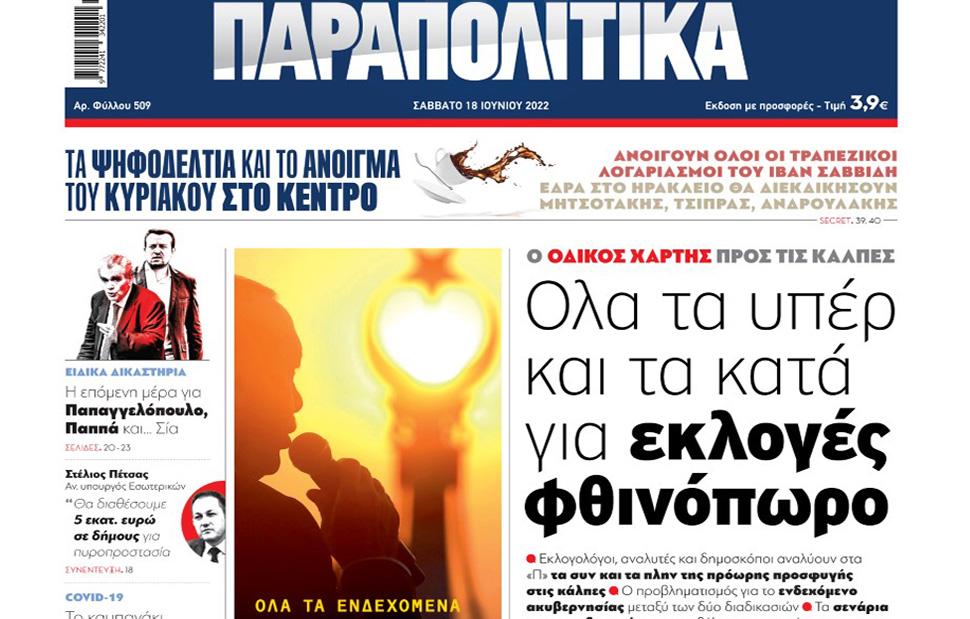 Αύριο, Σάββατο 18 Ιουνίου, η εφημερίδα ΠΑΡΑΠΟΛΙΤΙΚΑ κυκλοφορεί σε όλα τα περίπτερα της χώρας με πλούσια θεματολογία και πολλές αποκλειστικότητες. Αποκαλυπτικά θέματα, ρεπορτάζ και μεγάλες προσφορές για όλους τους αναγνώστες.