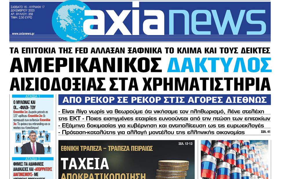 Με τίτλο: «Αμερικανικός δάκτυλος αισιοδοξίας στα χρηματιστήρια» κυκλοφορεί αύριο, Σάββατο 16 Δεκεμβρίου η «Axianews».