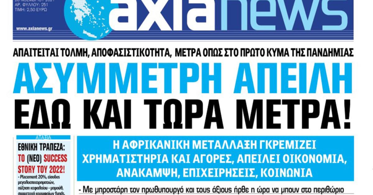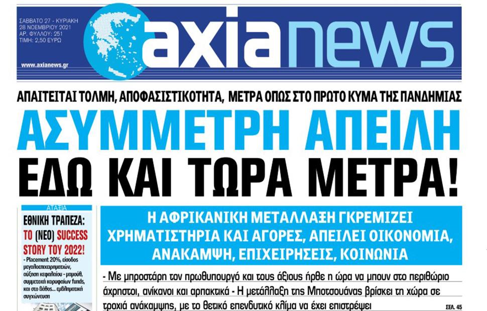 Με τίτλο: «Ασύμμετρη απειλή - Εδώ και τώρα μέτρα!» κυκλοφορεί αύριο, Σάββατο 27 Νοεμβρίου η «Axianews».