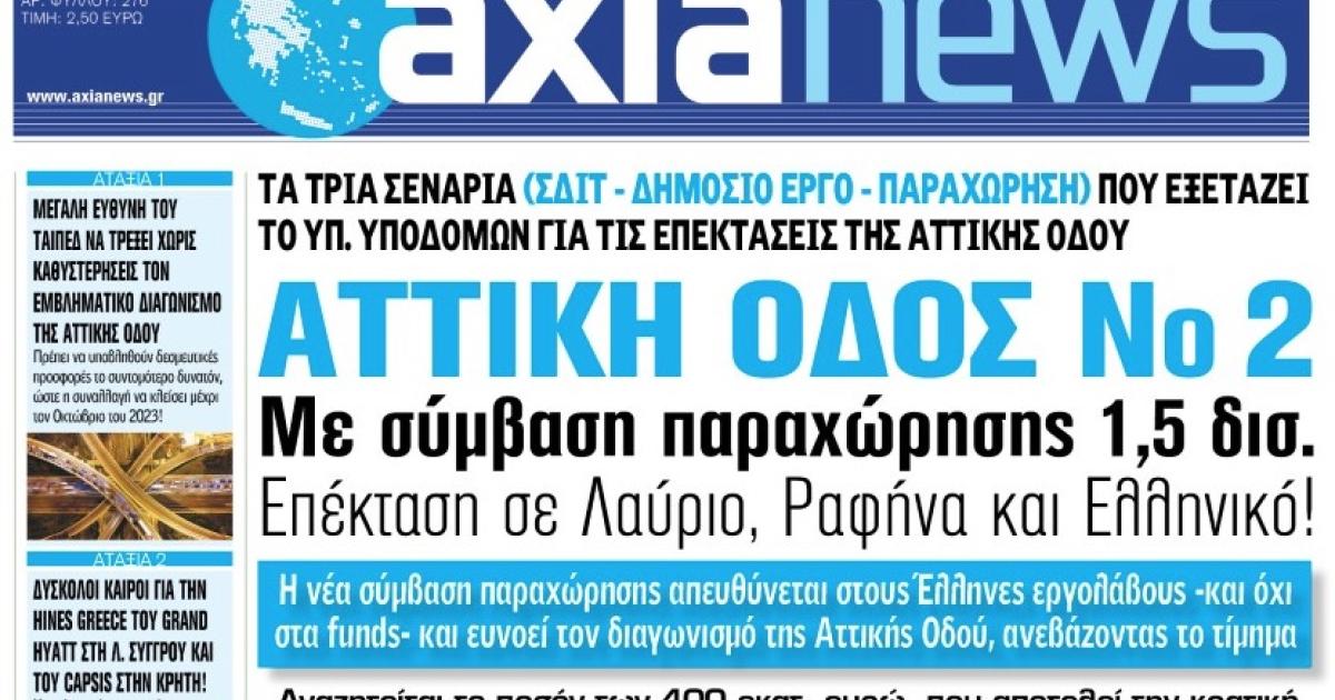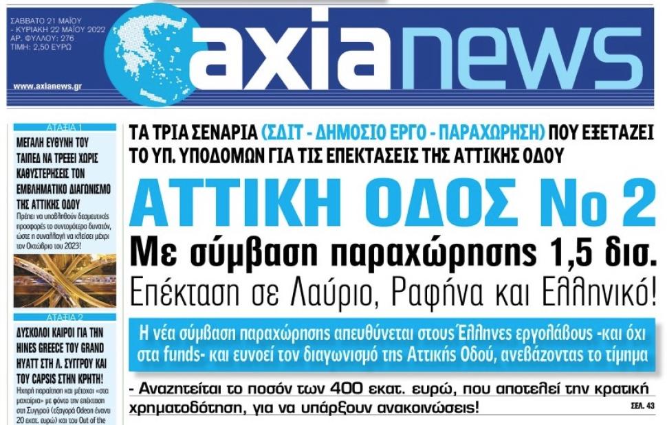 Με τίτλο: «Αττική οδός Νο2» κυκλοφορεί αύριο, Σάββατο 21 Μαΐου, η «Axianews».