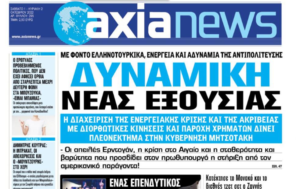Με τίτλο: «Δυναμική νέας εξουσίας» κυκλοφορεί αύριο Σάββατο 1 Οκτωβρίου η «Axianews».