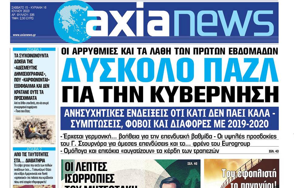 Με τίτλο: «Δύσκολο παζλ για την κυβέρνηση» κυκλοφορεί αύριο, Σάββατο 15 Ιουλίου, η «Axianews».