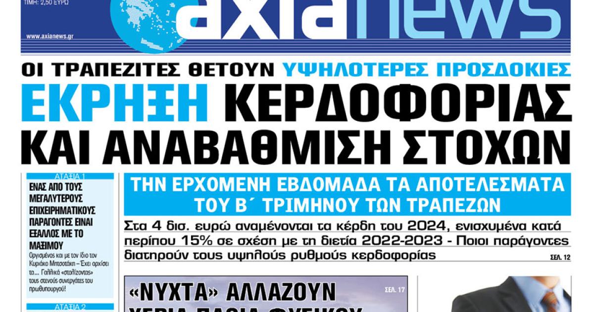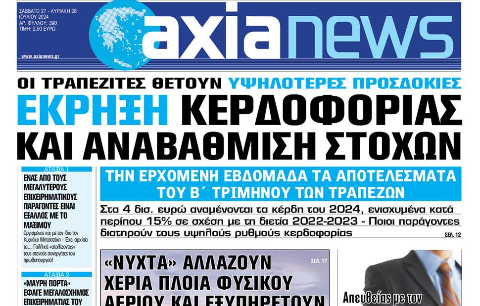 Με τίτλο: «Έκρηξη κερδοφορίας και αναβάθμιση στόχων» κυκλοφορεί αύριο, Σάββατο 27 Ιουλίου, η «Axianews».