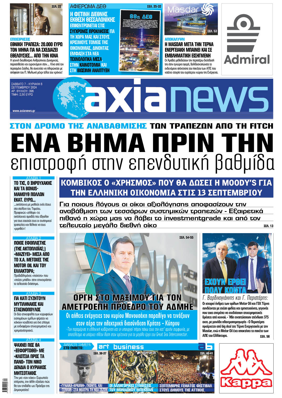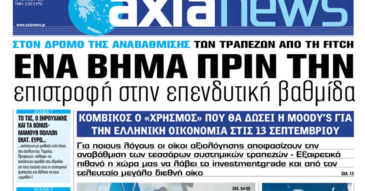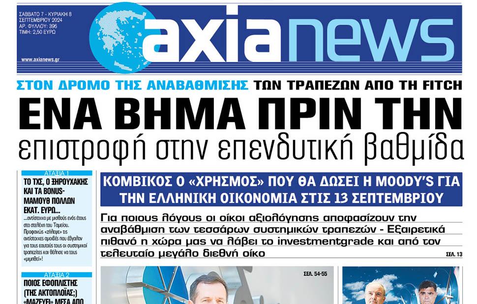 Με τίτλο: «Ένα βήμα πριν την επιστροφή στην επενδυτική βαθμίδα» κυκλοφορεί αύριο, Σάββατο 7 Σεπτεμβρίου, η «Axianews».