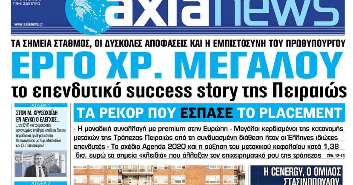 Με τίτλο: «Έργο Χρ. Μεγάλου το επενδυτικό success story της Πειραιώς» κυκλοφορεί αύριο, Σάββατο 9 Μαρτίου η «Axianews».