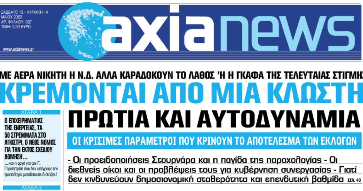 Με τίτλο: «Κρέμονται απο μια κλωστή πρωτιά και αυτοδυναμία» κυκλοφορεί το Σάββατο 13 Μαΐου η «Axianews».