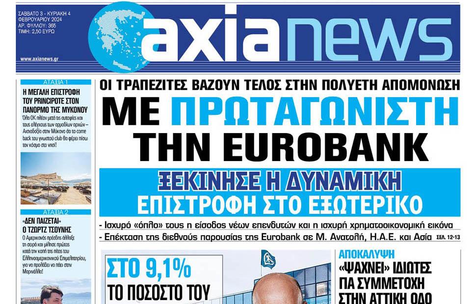 Με τίτλο: «Με πρωταγωνιστή την Eurobank ξεκίνησε η δυναμική επιστροφή στο εξωτερικό» κυκλοφορεί αύριο, Σάββατο 3 Φεβρουαρίου η «Axianews».