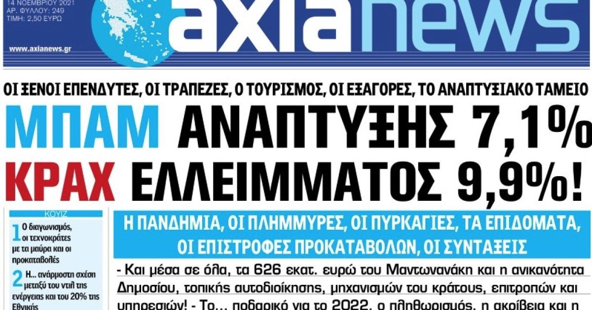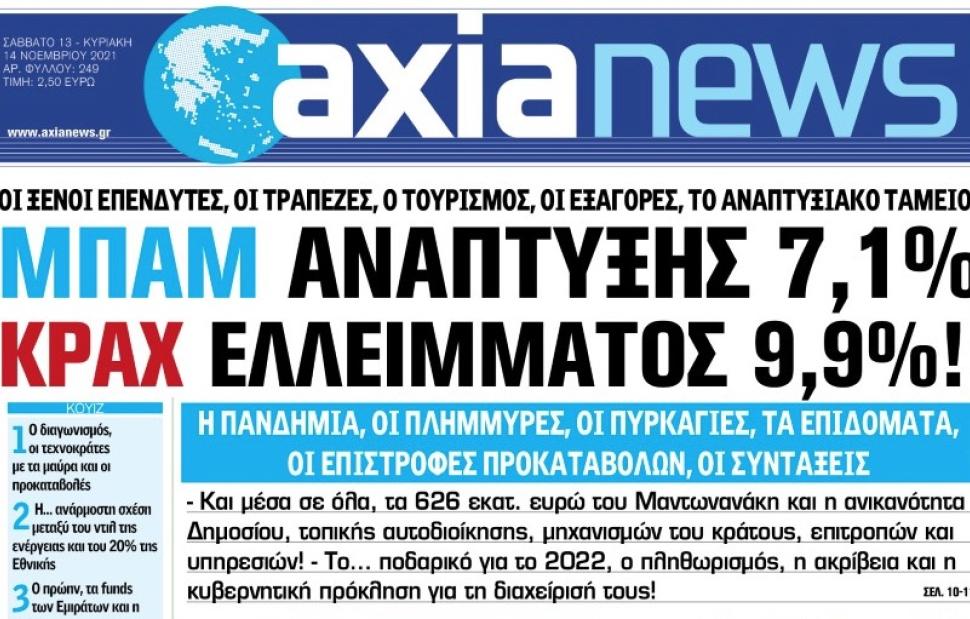 Με τίτλο: «Μπαμ ανάπτυξης 7,1%, κραχ ελλείμματος 9.9%» κυκλοφορεί αύριο, Σάββατο 13 Νοεμβρίου, η «Axianews».