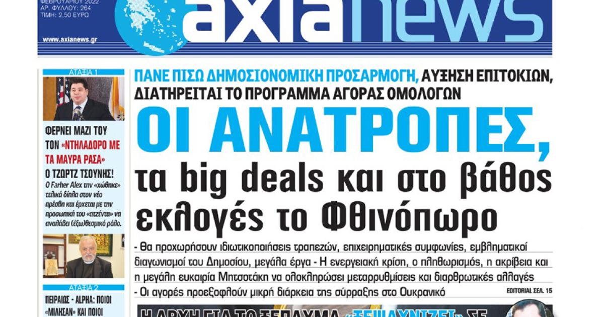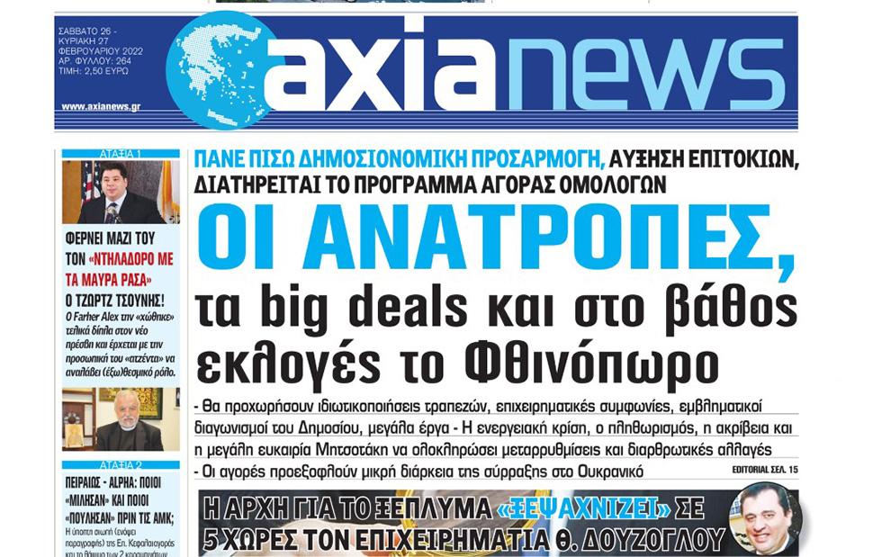 Με τίτλο: «Οι ανατροπές, τα big deals και στο βάθος εκλογές το φθινόπωρο» κυκλοφορεί αύριο, Σάββατο 26 Φεβρουαρίου, η «Axianews».
