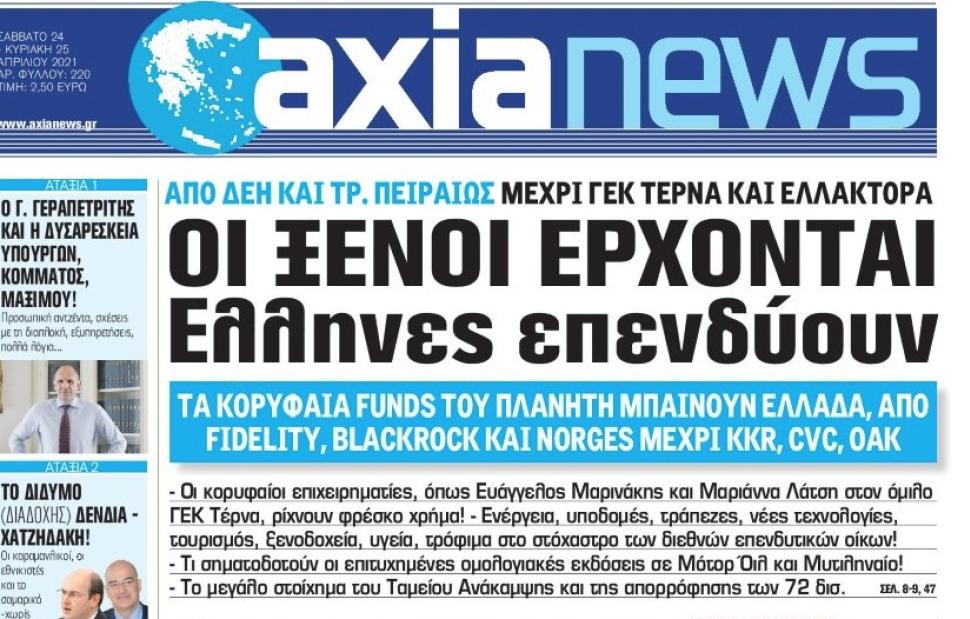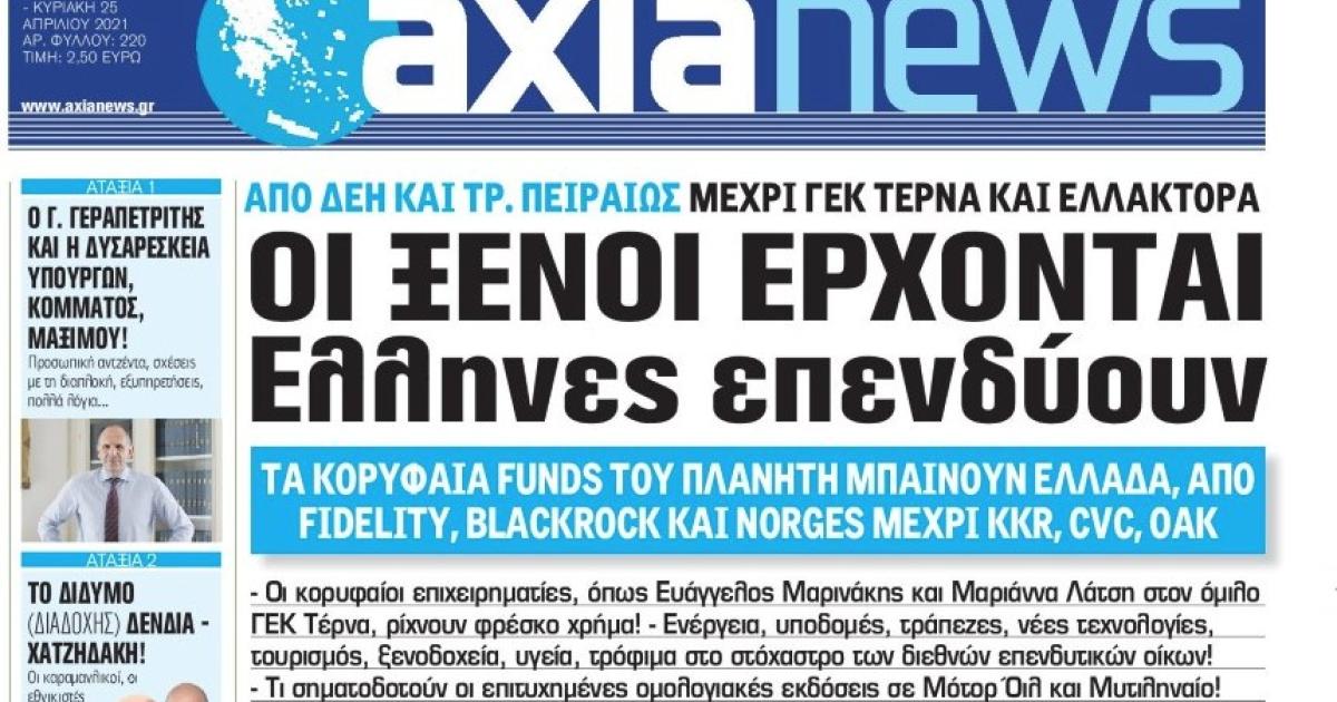Με τίτλο: «Οι ξένοι έρχονται, Έλληνες επενδύουν», κυκλοφορεί αύριο, Σάββατο 24 Απριλίου η Axianews.