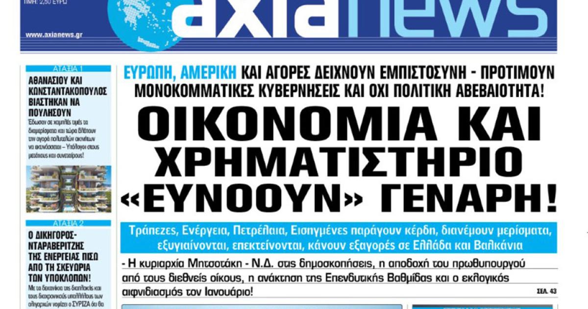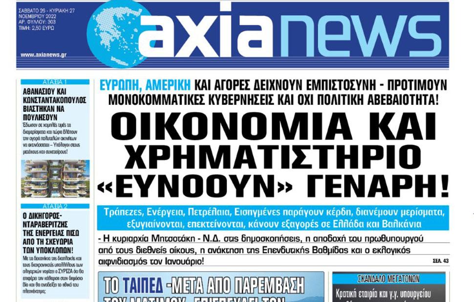Με τίτλο: «Οικονομία και χρηματιστήριο "ευνοούν" Γενάρη!» κυκλοφορεί αύριο, Σάββατο 26 Νοεμβρίου, η «Axianews».