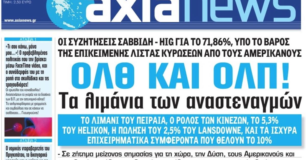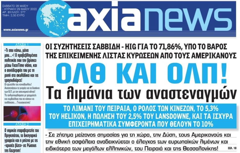 Με τίτλο: «ΟΛΘ και ΟΛΠ! - Τα λιμάνια των αναστεναγμών» κυκλοφορεί αύριο, Σάββατο 28 Μαΐου η «Axianews».