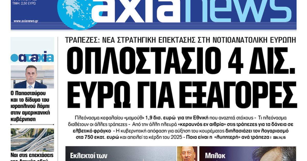Με τίτλο: «Οπλοστάσιο 4 δισ. ευρώ για εξαγορές» κυκλοφορεί αύριο, Σάββατο 15 Νοεμβρίου, η «Axianews».