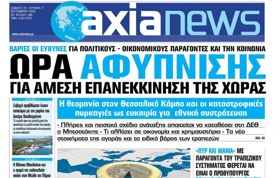 Με τίτλο: «Ώρα αφύπνισης για άμεση επανεκκίνηση της χώρας» κυκλοφορεί αύριο, Σάββατο 16 Σεπτεμβρίου η «Axianews».