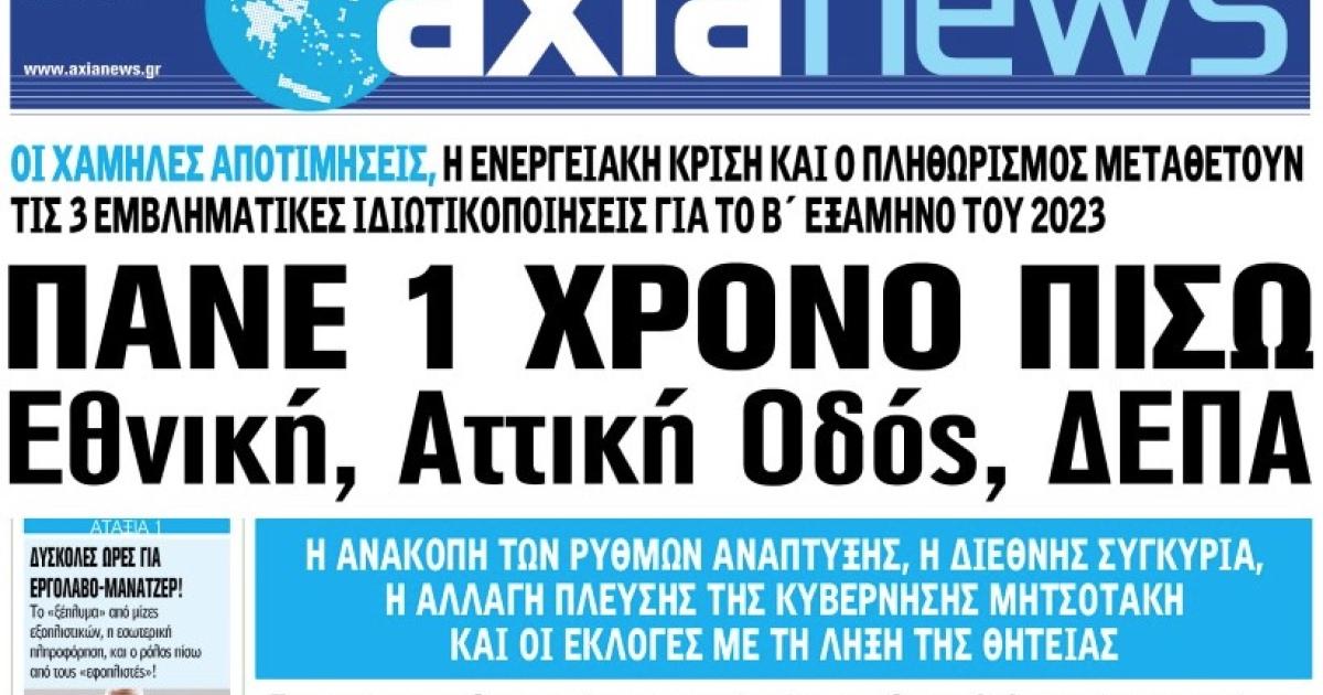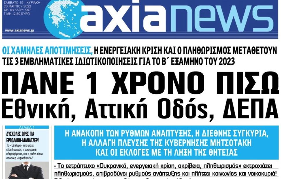 Με τίτλο: «Πάνε 1 χρόνο πίσω Εθνική, Αττική Οδός, ΔΕΠΑ» κυκλοφορεί αύριο, Σάββατο 19 Μαρτίου η «Axianews».